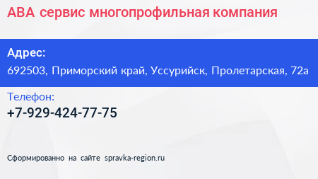 АВА-сервис, многопрофильная компания по адресу 692503, Приморский край, Уссурийск, Пролетарская, 72а в дальнейшем Организация, размещена в следующих категориях: