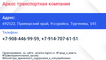 Аркос, транспортная компания по адресу 692522, Приморский край, Уссурийск, Тургенева, 145 в дальнейшем Организация, размещена в следующих категориях: