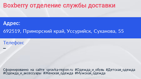 Boxberry, отделение службы доставки по адресу 692519, Приморский край, Уссурийск, Суханова, 55 в дальнейшем Организация, размещена в следующих категориях: