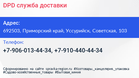 DPD, служба доставки по адресу 692503, Приморский край, Уссурийск, Советская, 103 в дальнейшем Организация, размещена в следующих категориях: