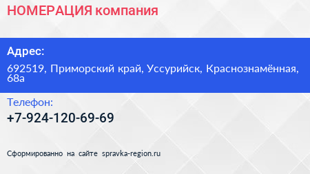 НОМЕРАЦИЯ, компания по адресу 692519, Приморский край, Уссурийск, Краснознамённая, 68а в дальнейшем Организация, размещена в следующих категориях: