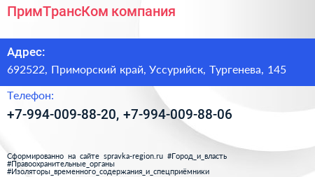 ПримТрансКом, компания по адресу 692522, Приморский край, Уссурийск, Тургенева, 145 в дальнейшем Организация, размещена в следующих категориях:
