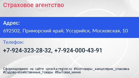 Страховое агентство по адресу 692502, Приморский край, Уссурийск, Московская, 10 в дальнейшем Организация, размещена в следующих категориях: