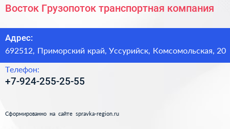 Восток-Грузопоток, транспортная компания по адресу 692512, Приморский край, Уссурийск, Комсомольская, 20 в дальнейшем Организация, размещена в следующих категориях: