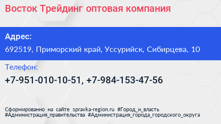 Восток Трейдинг, оптовая компания по адресу 692519, Приморский край, Уссурийск, Сибирцева, 10 в дальнейшем Организация, размещена в следующих категориях: