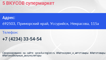 5 ВКУСОВ, супермаркет по адресу 692503, Приморский край, Уссурийск, Некрасова, 115а в дальнейшем Организация, размещена в следующих категориях: