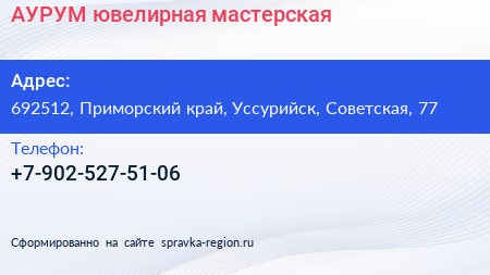АУРУМ, ювелирная мастерская по адресу 692512, Приморский край, Уссурийск, Советская, 77 в дальнейшем Организация, размещена в следующих категориях: