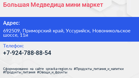 Большая Медведица, мини-маркет по адресу 692509, Приморский край, Уссурийск, Новоникольское шоссе, 11и в дальнейшем Организация, размещена в следующих категориях: