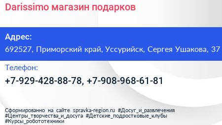 Darissimo, магазин подарков по адресу 692527, Приморский край, Уссурийск, Сергея Ушакова, 37 в дальнейшем Организация, размещена в следующих категориях: