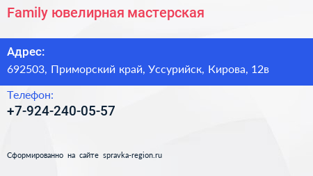 Family, ювелирная мастерская по адресу 692503, Приморский край, Уссурийск, Кирова, 12в в дальнейшем Организация, размещена в следующих категориях: