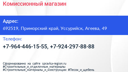 Комиссионный магазин по адресу 692519, Приморский край, Уссурийск, Агеева, 49 в дальнейшем Организация, размещена в следующих категориях: