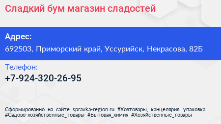 Сладкий бум, магазин сладостей по адресу 692503, Приморский край, Уссурийск, Некрасова, 82Б в дальнейшем Организация, размещена в следующих категориях: