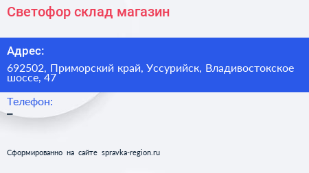 Светофор, склад-магазин по адресу 692502, Приморский край, Уссурийск, Владивостокское шоссе, 47 в дальнейшем Организация, размещена в следующих категориях: