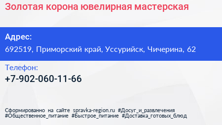 Золотая корона, ювелирная мастерская по адресу 692519, Приморский край, Уссурийск, Чичерина, 62 в дальнейшем Организация, размещена в следующих категориях: