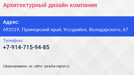 Архитектурный дизайн, компания по адресу 692519, Приморский край, Уссурийск, Володарского, 67 в дальнейшем Организация, размещена в следующих категориях: