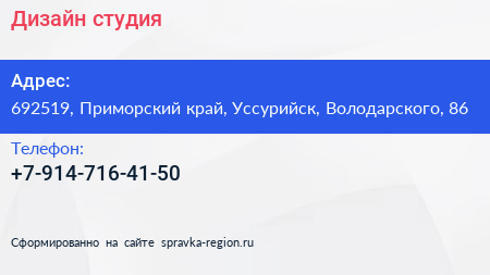 Дизайн студия по адресу 692519, Приморский край, Уссурийск, Володарского, 86 в дальнейшем Организация, размещена в следующих категориях: