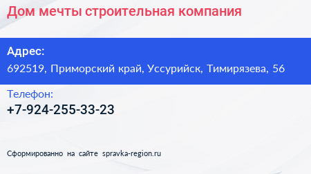 Дом мечты, строительная компания по адресу 692519, Приморский край, Уссурийск, Тимирязева, 56 в дальнейшем Организация, размещена в следующих категориях: