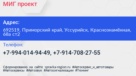 МИГ-проект по адресу 692519, Приморский край, Уссурийск, Краснознамённая, 68а ст2 в дальнейшем Организация, размещена в следующих категориях: