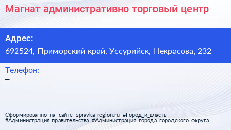 Магнат, административно-торговый центр по адресу 692524, Приморский край, Уссурийск, Некрасова, 232 в дальнейшем Организация, размещена в следующих категориях: