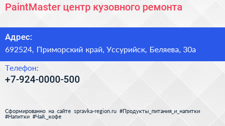 PaintMaster, центр кузовного ремонта по адресу 692524, Приморский край, Уссурийск, Беляева, 30а в дальнейшем Организация, размещена в следующих категориях: