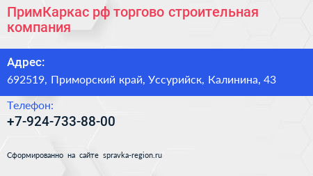 ПримКаркас.рф, торгово-строительная компания по адресу 692519, Приморский край, Уссурийск, Калинина, 43 в дальнейшем Организация, размещена в следующих категориях:
