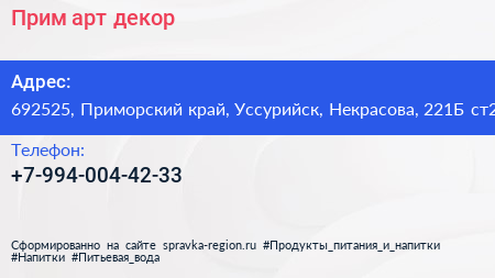 Прим.арт-декор по адресу 692525, Приморский край, Уссурийск, Некрасова, 221Б ст2 в дальнейшем Организация, размещена в следующих категориях: