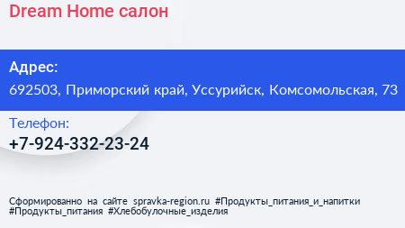 Dream Home, салон по адресу 692503, Приморский край, Уссурийск, Комсомольская, 73 в дальнейшем Организация, размещена в следующих категориях: