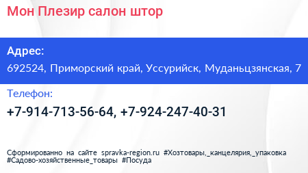 Мон Плезир, салон штор по адресу 692524, Приморский край, Уссурийск, Муданьцзянская, 7 в дальнейшем Организация, размещена в следующих категориях: