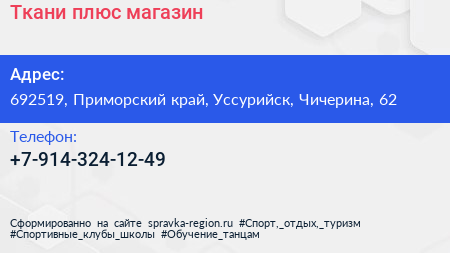 Ткани плюс, магазин по адресу 692519, Приморский край, Уссурийск, Чичерина, 62 в дальнейшем Организация, размещена в следующих категориях: