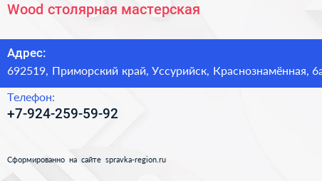 Wood, столярная мастерская по адресу 692519, Приморский край, Уссурийск, Краснознамённая, 6а в дальнейшем Организация, размещена в следующих категориях: