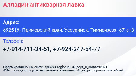 Алладин, антикварная лавка по адресу 692519, Приморский край, Уссурийск, Тимирязева, 67 ст3 в дальнейшем Организация, размещена в следующих категориях: