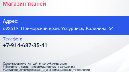 Магазин тканей по адресу 692519, Приморский край, Уссурийск, Калинина, 54 в дальнейшем Организация, размещена в следующих категориях: