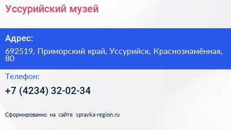 Уссурийский музей по адресу 692519, Приморский край, Уссурийск, Краснознамённая, 80 в дальнейшем Организация, размещена в следующих категориях: