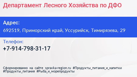 Департамент Лесного Хозяйства по ДФО по адресу 692519, Приморский край, Уссурийск, Тимирязева, 29 в дальнейшем Организация, размещена в следующих категориях: