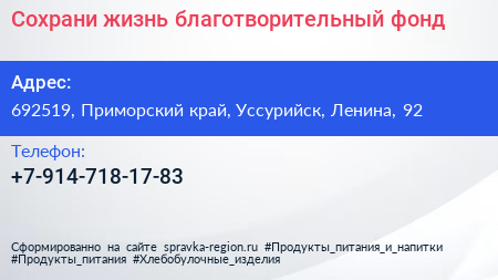 Сохрани жизнь, благотворительный фонд по адресу 692519, Приморский край, Уссурийск, Ленина, 92 в дальнейшем Организация, размещена в следующих категориях: