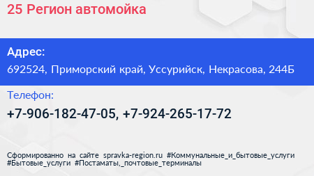 25 Регион, автомойка по адресу 692524, Приморский край, Уссурийск, Некрасова, 244Б в дальнейшем Организация, размещена в следующих категориях: