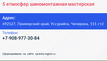 5 атмосфер, шиномонтажная мастерская по адресу 692527, Приморский край, Уссурийск, Чичерина, 151 ст2 в дальнейшем Организация, размещена в следующих категориях: