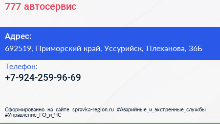 777, автосервис по адресу 692519, Приморский край, Уссурийск, Плеханова, 36Б в дальнейшем Организация, размещена в следующих категориях: