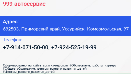 999, автосервис по адресу 692503, Приморский край, Уссурийск, Комсомольская, 97 в дальнейшем Организация, размещена в следующих категориях: