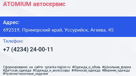 ATOMIUM, автосервис по адресу 692519, Приморский край, Уссурийск, Агеева, 45 в дальнейшем Организация, размещена в следующих категориях: