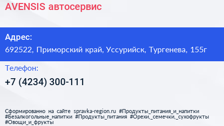 AVENSIS, автосервис по адресу 692522, Приморский край, Уссурийск, Тургенева, 155г в дальнейшем Организация, размещена в следующих категориях: