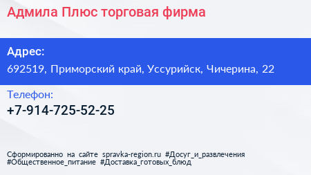 Адмила Плюс, торговая фирма по адресу 692519, Приморский край, Уссурийск, Чичерина, 22 в дальнейшем Организация, размещена в следующих категориях: