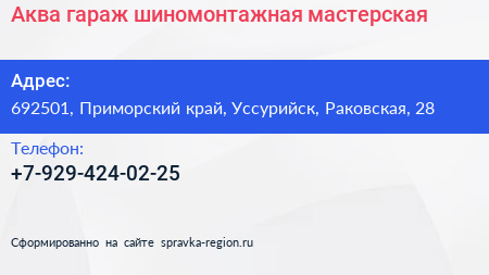 Аква гараж, шиномонтажная мастерская по адресу 692501, Приморский край, Уссурийск, Раковская, 28 в дальнейшем Организация, размещена в следующих категориях: