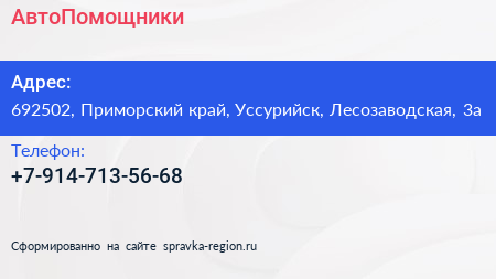 АвтоПомощники по адресу 692502, Приморский край, Уссурийск, Лесозаводская, 3а в дальнейшем Организация, размещена в следующих категориях: