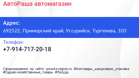 АвтоРаша, автомагазин по адресу 692522, Приморский край, Уссурийск, Тургенева, 103 в дальнейшем Организация, размещена в следующих категориях: