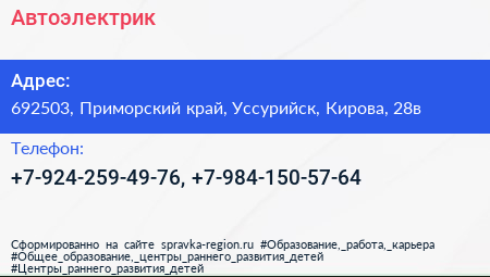 Автоэлектрик по адресу 692503, Приморский край, Уссурийск, Кирова, 28в в дальнейшем Организация, размещена в следующих категориях: