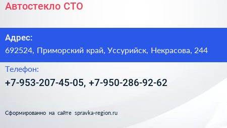 Автостекло, СТО по адресу 692524, Приморский край, Уссурийск, Некрасова, 244 в дальнейшем Организация, размещена в следующих категориях: