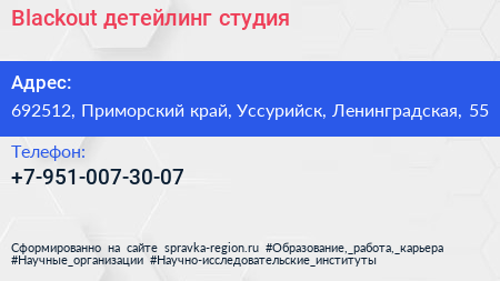Blackout, детейлинг-студия по адресу 692512, Приморский край, Уссурийск, Ленинградская, 55 в дальнейшем Организация, размещена в следующих категориях: