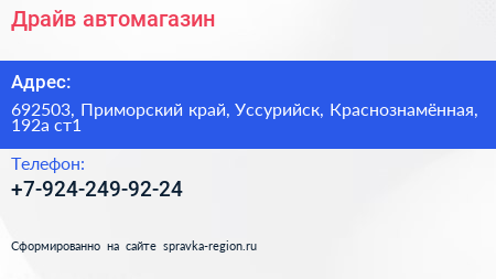 Драйв, автомагазин по адресу 692503, Приморский край, Уссурийск, Краснознамённая, 192а ст1 в дальнейшем Организация, размещена в следующих категориях: