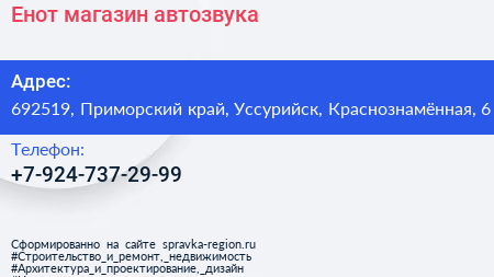 Енот, магазин автозвука по адресу 692519, Приморский край, Уссурийск, Краснознамённая, 6 в дальнейшем Организация, размещена в следующих категориях: